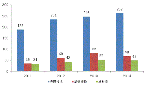 2014年登記科技成果按照成果類別劃分可分為應(yīng)用技術(shù)類、軟科學(xué)類和基礎(chǔ)理論類三種,其中,應(yīng)用技術(shù)類科技成果262項,占登記總數(shù)的69.1%,比2013年增加16項;基礎(chǔ)理論類科技成果68項,占登記總數(shù)的17.9%,比2013年減少14項;軟科學(xué)類科技成果49項,占登記總數(shù)的12.9%,比2013年減少3項(見圖1-3)。