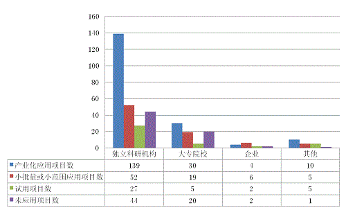 從產(chǎn)業(yè)化應(yīng)用成果在各單位登記的應(yīng)用技術(shù)成果所占比例看,獨立科研機(jī)構(gòu)、大專院校、企業(yè)、其他單位分別為40.5%、28.6%、47.6%和62.1%,產(chǎn)業(yè)化應(yīng)用成果比重均比較高。其次為小批量應(yīng)用項目,還有相當(dāng)部分成果因種種原因未應(yīng)用(見圖2-2)。