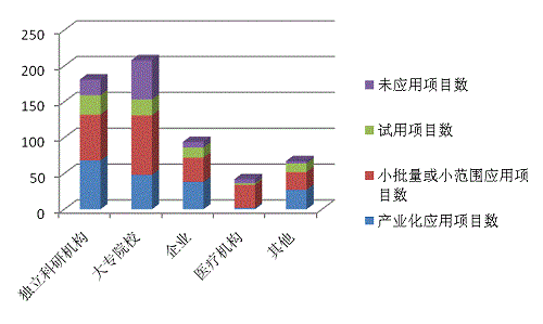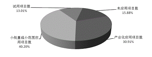 2014年度登記的592項(xiàng)應(yīng)用技術(shù)科技成果中,產(chǎn)業(yè)化應(yīng)用的數(shù)量達(dá)到183項(xiàng),小批量或小范圍應(yīng)用項(xiàng)目的數(shù)量為238項(xiàng),試用項(xiàng)目77項(xiàng),未應(yīng)用項(xiàng)目數(shù)為94項(xiàng)(見圖8)。