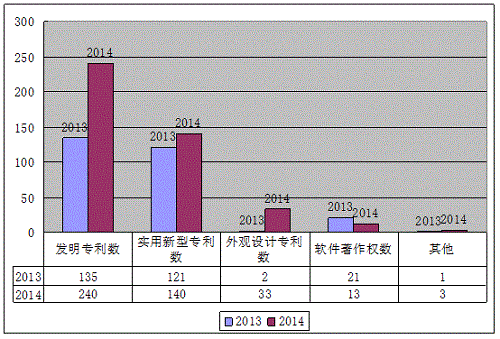 在登記的237項(xiàng)科技成果中鑒定項(xiàng)目數(shù)193項(xiàng),驗(yàn)收項(xiàng)目數(shù)40項(xiàng),行業(yè)準(zhǔn)入數(shù)1項(xiàng),評(píng)估項(xiàng)目數(shù)2項(xiàng),結(jié)題項(xiàng)目數(shù)1項(xiàng)。數(shù)據(jù)表明,成果評(píng)價(jià)方式大多采取鑒定評(píng)價(jià)方式。2014年知識(shí)產(chǎn)權(quán)數(shù)共計(jì)429項(xiàng),其中發(fā)明專利240項(xiàng),實(shí)用新型專利140項(xiàng),外觀設(shè)計(jì)專利33項(xiàng),軟件著作權(quán)13項(xiàng),其他3項(xiàng)。其中已授權(quán)專利248項(xiàng)。在248項(xiàng)已授權(quán)專利中,企業(yè)189項(xiàng),獨(dú)立科研機(jī)構(gòu)13項(xiàng),大專院校36項(xiàng),醫(yī)療機(jī)構(gòu)2項(xiàng),其它8項(xiàng)。與去年數(shù)據(jù)對(duì)比分析, 數(shù)據(jù)顯示今年的知識(shí)產(chǎn)權(quán)數(shù)有很大提升。