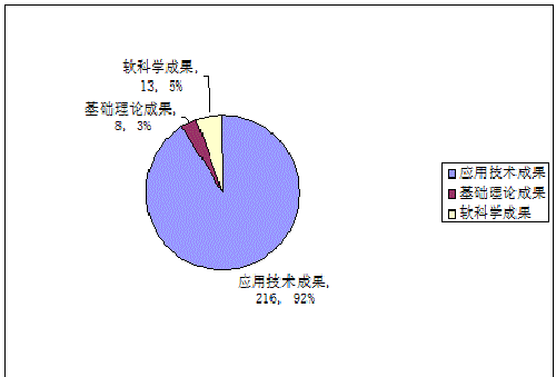 今年登記的237項(xiàng)科技成果中,應(yīng)用技術(shù)成果216項(xiàng),占成果總數(shù)的92%;基礎(chǔ)理論成果8項(xiàng),占成果總數(shù)的3%;軟科學(xué)成果13項(xiàng),占成果總數(shù)的5%。