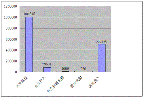 據(jù)統(tǒng)計(jì),2014年登記成果的經(jīng)費(fèi)實(shí)際投入額為1591458萬元,大專院校投入1004315萬元,企業(yè)投入79584萬元,獨(dú)立科研機(jī)構(gòu)投入為4060萬元,醫(yī)療機(jī)構(gòu)投入266萬元,其他投入503276萬元。其中大專院校經(jīng)費(fèi)投入較大,獨(dú)立科研機(jī)構(gòu)及醫(yī)療機(jī)構(gòu)等單位經(jīng)費(fèi)投入較少。