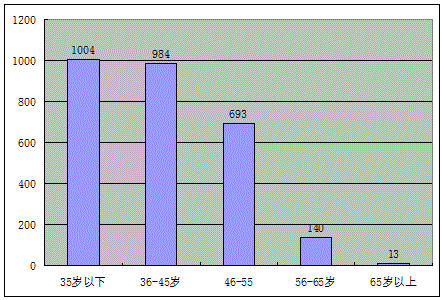 3、年齡結(jié)構(gòu):按科技成果完成人員年齡統(tǒng)計(jì),35歲以下為1004人,36-45歲為984人,46-55歲為693人,56-65歲為140人,65歲以上為13人。數(shù)據(jù)表明,中青年科技人員是科技成果創(chuàng)造的主體,而35歲以下的青年科技人員逐步成為科技創(chuàng)新的骨干力量。