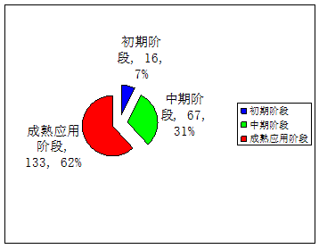 在登記的216項(xiàng)應(yīng)用技術(shù)成果中,處于初期階段的成果16項(xiàng)約占7%,中期階段的成果67項(xiàng)約占31%,成熟應(yīng)用階段的成果133項(xiàng)約占62%,從統(tǒng)計(jì)數(shù)據(jù)看,大多數(shù)項(xiàng)目都已處在成熟應(yīng)用階段。
