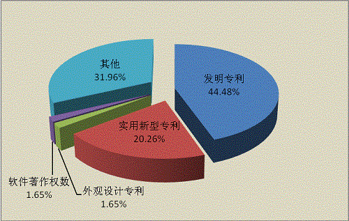 全省登記的科技成果中獲得知識(shí)產(chǎn)權(quán)數(shù)量達(dá)到607項(xiàng),其中:發(fā)明專(zhuān)利數(shù)270項(xiàng),占總數(shù)的44.48%;實(shí)用新型專(zhuān)利數(shù)123項(xiàng),占總數(shù)的20.26%;外觀(guān)設(shè)計(jì)專(zhuān)利10項(xiàng),占總數(shù)的1.65%;軟件著作權(quán)數(shù)10項(xiàng),占總數(shù)的1.65%;其他194項(xiàng),占總數(shù)的31.96%(見(jiàn)圖1-1)。