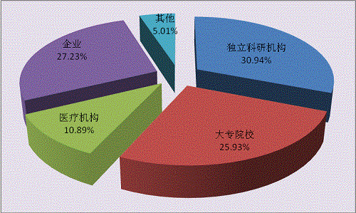 科技成果按單位屬性分布,獨(dú)立科研機(jī)構(gòu)是科技成果主要完成單位。在2014登記的成果459項(xiàng)中,按成果登記量排序依次是:獨(dú)立科研機(jī)構(gòu)142項(xiàng),占30.94%;企業(yè)125項(xiàng),占27.23%;大專(zhuān)院校119項(xiàng),占25.93%;醫(yī)療機(jī)構(gòu)50項(xiàng),占10.89%;其他23項(xiàng)占5.01%。(見(jiàn)表1-2,圖1-2)。