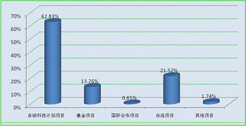 2014年登記的成果主要以各類(lèi)計(jì)劃項(xiàng)目為主,政府資金起主導(dǎo)作用,其中來(lái)源于各類(lèi)科技計(jì)劃項(xiàng)目的成果289項(xiàng),占登記成果總數(shù)的62.83%;基金項(xiàng)目61項(xiàng),占登記成果總數(shù)的13.26%;國(guó)際合作項(xiàng)目3項(xiàng),占登記成果總數(shù)的0.65%;自選項(xiàng)目99項(xiàng),占登記成果總數(shù)的21.52%;其他項(xiàng)目8項(xiàng),占登記成果總數(shù)的1.74%(見(jiàn)圖1-3)。