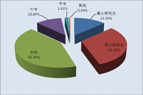 從2014年登記的科研成果完成人員中來(lái)看,大學(xué)本科學(xué)歷以上人員占87.05%,成為各類(lèi)成果的主要完成人員,其中,本科學(xué)歷1754人次,占總?cè)藬?shù)的42.25%;碩士研究生1304人次,占31.41%;博士研究生556人次,占13.39%;大專(zhuān)452人次,占10.89%;中專(zhuān)及其他共計(jì)67人次,占1.61%(見(jiàn)圖1-4)。