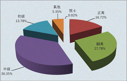 從技術(shù)職稱(chēng)結(jié)構(gòu)來(lái)看,2014年的登記成果完成人員中,具備副高級(jí)以上人員為1848人次,達(dá)到完成人員總數(shù)的44.52%。其中:院士1人次,正高級(jí)技術(shù)職稱(chēng)694人次,副高級(jí)1153人次,占27.78%;中級(jí)技術(shù)職稱(chēng)1509人次,占36.35%;初級(jí)技術(shù)職稱(chēng)的研究人員572人次,占13.78%;其他研究人員222人次,占5.35%(見(jiàn)圖1-5)。