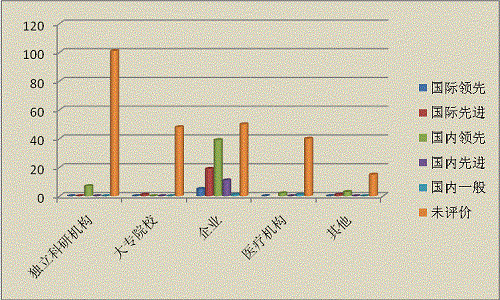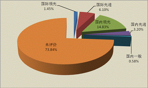 根據(jù)對(duì)2014年統(tǒng)計(jì)的344項(xiàng)應(yīng)用技術(shù)科技成果評(píng)價(jià)水平分類(lèi),其中達(dá)到國(guó)際領(lǐng)先水平的成果5項(xiàng),占1.45%;達(dá)到國(guó)際先進(jìn)水平的21項(xiàng),占6.10%;達(dá)到國(guó)內(nèi)領(lǐng)先水平的51項(xiàng),占14.83%;達(dá)到國(guó)內(nèi)先進(jìn)水平的11項(xiàng),占3.20%;國(guó)內(nèi)一般水平的2項(xiàng),占0.58%;未評(píng)價(jià)水平的254項(xiàng),占73.84%(見(jiàn)表2-1,圖2-1)。