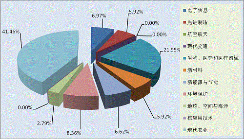 統(tǒng)計(jì)資料顯示,在344項(xiàng)應(yīng)用技術(shù)成果中,有287項(xiàng)屬于高新技術(shù)領(lǐng)域,占應(yīng)用技術(shù)成果總數(shù)的83.43%。在287項(xiàng)高新技術(shù)領(lǐng)域中,現(xiàn)代農(nóng)業(yè)領(lǐng)域的科技成果最多,達(dá)119項(xiàng),占高新技術(shù)領(lǐng)域的41.46%;其次是生物、醫(yī)藥和醫(yī)療器械領(lǐng)域的科技成果,有63項(xiàng),占21.95%;環(huán)境保護(hù)領(lǐng)域24項(xiàng),占8.36%;電子信息領(lǐng)域20項(xiàng),占6.97%;新能源與節(jié)能領(lǐng)域19項(xiàng),占6.62%;新材料領(lǐng)域17項(xiàng),占5.92%;先進(jìn)制造領(lǐng)域17項(xiàng),占5.92%;地球、空間與海洋領(lǐng)域8項(xiàng),占2.79%;現(xiàn)代交通領(lǐng)域、航空航天領(lǐng)域、核應(yīng)用技術(shù)均無(wú)高新技術(shù)成果。另有57項(xiàng)成果屬于非高新技術(shù)領(lǐng)域(見(jiàn)圖2-4)。