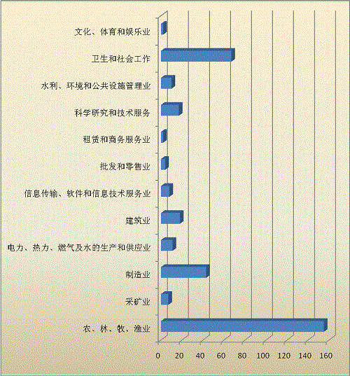 2014年我省344項(xiàng)應(yīng)用技術(shù)成果,廣泛應(yīng)用在農(nóng)林牧漁業(yè)、衛(wèi)生、社會(huì)工作行業(yè)、制造業(yè)、建筑業(yè)等12個(gè)大行業(yè)中。其中,應(yīng)用于農(nóng)、林、牧、漁業(yè)的成果有155項(xiàng),占45.06%;衛(wèi)生和社會(huì)工作行業(yè)67項(xiàng),占19.48%;制造業(yè)43項(xiàng),占12.50%;建筑業(yè)18項(xiàng),占5.23%;科學(xué)研究和技術(shù)服務(wù)業(yè)17項(xiàng),占4.94%;電力、熱力、燃?xì)饧八纳a(chǎn)和供應(yīng)業(yè)11項(xiàng),占3.20%;水利、環(huán)境和公共設(shè)施管理業(yè)10項(xiàng),占2.91%;信息傳輸、軟件和信息技術(shù)服務(wù)業(yè)8項(xiàng),占2.33%;采礦業(yè)7項(xiàng),占2.03%;批發(fā)和零售業(yè)4項(xiàng),分別占1.16%;租賃和商務(wù)服務(wù)業(yè)及文化、體育和娛樂(lè)業(yè)均為2項(xiàng),均占0.58%。公共管理、社會(huì)保障和社會(huì)組織、交通運(yùn)輸、倉(cāng)儲(chǔ)和郵政業(yè)、住宿和餐飲業(yè)等行業(yè)均無(wú)應(yīng)用技術(shù)成果。(見(jiàn)圖2-5)。