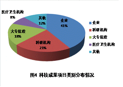 按完成單位分類,206項成果中由企業(yè)完成的85項、科研機構(gòu)完成的43項(其中科研機構(gòu)轉(zhuǎn)制型企業(yè)完成的6項)、大專院校完成的38項、醫(yī)療衛(wèi)生機構(gòu)完成的16項、其他單位完成的24項(見圖4)。