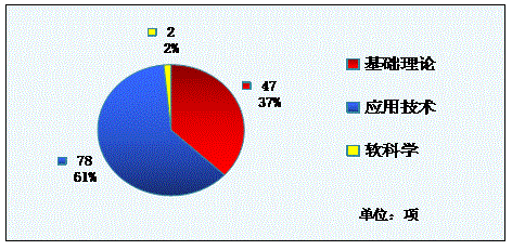 2015年全市共登記科技成果127項(xiàng),其中應(yīng)用技術(shù)類成果仍然高居登記成果的榜首,共78項(xiàng),占成果登記總量的61%,較2013年的比例下降10個(gè)百分點(diǎn);基礎(chǔ)理論類成果47項(xiàng),占成果登記總量的37%,較2013年的比例上升14個(gè)百分點(diǎn);軟科學(xué)類成果2項(xiàng),占成果登記總量的2%。(見圖1)