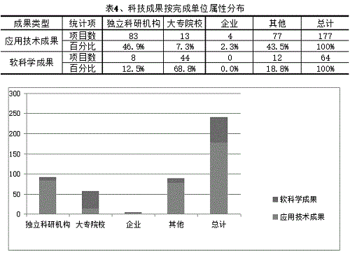 針對公安單位的特殊性,為使登記的成果數(shù)據(jù)一致,在登記成果時,我們將公安部部屬研究所均歸為獨立科研機構(gòu),部屬院校及各地警校均歸為大專院校,而將公安部警犬技術(shù)研究所、基地、學(xué)校、各省市刑科所、各級公安單位及其技術(shù)部門均劃分到其他類中。在177項應(yīng)用技術(shù)成果中,獨立研究機構(gòu)和其他成果數(shù)量最多,分別占46.9%和43.5,反映出應(yīng)用技術(shù)成果基本由公安系統(tǒng)內(nèi)部完成。在64項軟科學(xué)成果中,大專院校占68.8%,反映出大專院校為軟科學(xué)成果的研究主體。見表4。