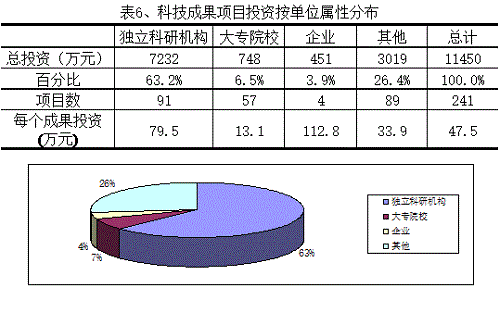 這里,投資的定義不是很明確,有些單位把項目建設(shè)費用統(tǒng)計在內(nèi),其中多為設(shè)備費用,故投資較高;而大專院校一般填報的是純科研費用,故看起來較少。見表6。