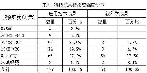 在177項應(yīng)用技術(shù)成果中投資額大于200萬元的科技成果共有13項,占總數(shù)的7.4%;投資在10萬以下的項目有66項,占總數(shù)的37.3%。在軟科學(xué)成果中,投資在10萬以下的項目有56項,占軟科學(xué)項目總數(shù)的88%。見表7。