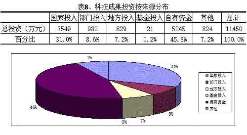本年度科技成果總投資為11450萬元。其中,自有資金5245萬元,占45.8%。自有資金涉及到各類項目的配套、研發(fā)費用,相對較多。詳見表8。