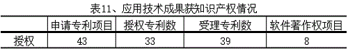 在177項應(yīng)用技術(shù)類成果中共有43項申請了專利,其中獲得授權(quán)專利33項,未授權(quán)已受理專利39項,有的項目獲高達(dá)5項授權(quán)專利;有8個項目獲得軟件著作權(quán)。從總體看,完成單位的知識產(chǎn)權(quán)意識有所提高。見表11。