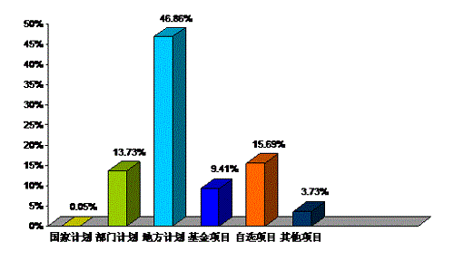 在登記的510項(xiàng)科技成果中,國家計(jì)劃項(xiàng)目為占成果總數(shù)的0.05%;部門計(jì)劃項(xiàng)目占13.73%;地方計(jì)劃項(xiàng)目占46.86%;部門、地方及民間基金項(xiàng)目占9.41%;國際合作項(xiàng)目占0.01%;橫向委托項(xiàng)目占0.01%;自選項(xiàng)目占15.69%;其他占3.73%(見圖6)。