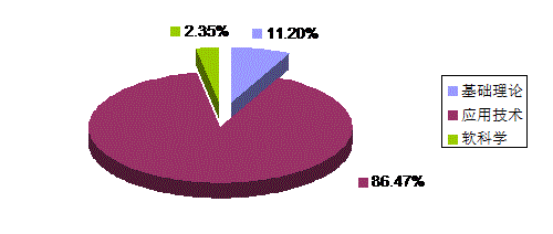 (二)應(yīng)用技術(shù)成果所占比例仍然較高。在吉林省科技廳2009年登記的510項(xiàng)科技成果中,軟科學(xué)成果為12項(xiàng)、基礎(chǔ)理論成果為57項(xiàng)、應(yīng)用技術(shù)成果為441項(xiàng),分別占登記科技成果總數(shù)的2.35%、11.20%和86.47%。應(yīng)用技術(shù)成果所占比例仍然較高,接近90%,具有地方科研的顯著特點(diǎn),反映出我省在應(yīng)用技術(shù)領(lǐng)域具有較強(qiáng)實(shí)力的同時(shí),也表明我省在軟科學(xué)、基礎(chǔ)理論研究方面的投入明顯不足,有待進(jìn)一步加強(qiáng)。
