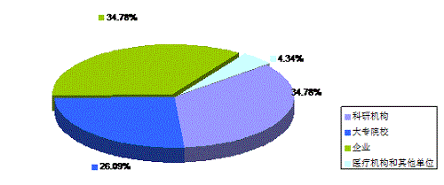 2009年吉林省科技廳登記的科技成果中有46個(gè)發(fā)明專利授權(quán),其中企業(yè)、獨(dú)立科研機(jī)構(gòu)的發(fā)明專利受權(quán)數(shù)均為16個(gè),均占總授權(quán)數(shù)的34.78%;大專院校為12個(gè),占26.09%;醫(yī)療機(jī)構(gòu)和其他單位共2個(gè),占4.34%(見圖8)。