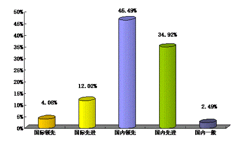 根據(jù)對(duì)441項(xiàng)應(yīng)用技術(shù)成果水平的分類統(tǒng)計(jì),達(dá)到國際領(lǐng)先水平的成果為18項(xiàng),占應(yīng)用技術(shù)成果總數(shù)的4.08%;達(dá)到國際先進(jìn)水平的成果53項(xiàng),占12.02%;達(dá)到國內(nèi)領(lǐng)先水平的成果205項(xiàng),占46.49%;達(dá)到國內(nèi)先進(jìn)水平的成果154項(xiàng),占34.92%;國內(nèi)一般水平的成果11項(xiàng),占2.49%(見圖9)。