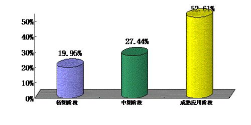 吉林省科技廳2009年登記的510項(xiàng)科技成果中,應(yīng)用技術(shù)成果為441項(xiàng),占登記成果總數(shù)的86.47%。在應(yīng)用技術(shù)成果中,處于大規(guī)模、大范圍成熟應(yīng)用階段的成果為232項(xiàng),占應(yīng)用技術(shù)成果總數(shù)的52.61%;處于中試或制備樣機(jī)、試樣等中期階段的成果為121項(xiàng),占應(yīng)用技術(shù)成果總數(shù)的27.44%;處于實(shí)驗(yàn)室、小試等初期階段的成果為88項(xiàng),占應(yīng)用技術(shù)成果總數(shù)的19.95%(見圖11)。