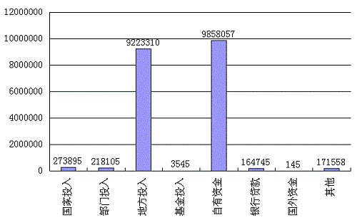 經(jīng)統(tǒng)計(jì),2009年登記項(xiàng)目總經(jīng)費(fèi)實(shí)際投入額為19913360萬(wàn)元,其中,國(guó)家投入273895萬(wàn)元,占1%;部門投入218105萬(wàn)元,占1%;地方投入9223310萬(wàn)元,占46%;自有資金9858057萬(wàn)元,占50%;自有資金與地方投入比例占主要部分。