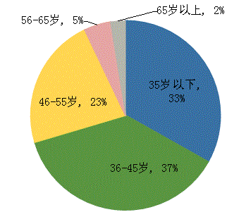 成果完成人員的年齡結(jié)構(gòu)為:35歲以下(含35歲)有1799人,36-45歲有2022人,46-55歲有1221人,56-65歲有245人,65歲以上有139人。55歲以下研究人員占93%,中青年已成為科技一線的主力軍。