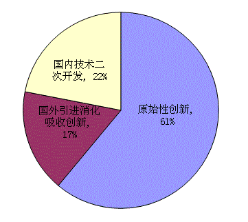 2009年江蘇省科技成果中原始性創(chuàng)新項(xiàng)目有356項(xiàng),占61%;國(guó)外引進(jìn)消化吸收創(chuàng)新項(xiàng)目99項(xiàng),占17%;國(guó)內(nèi)技術(shù)二次開發(fā)項(xiàng)目128項(xiàng),占22%。原始性創(chuàng)新項(xiàng)目占大多數(shù)。