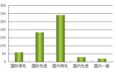 2009年江蘇省科技成果水平狀況,達(dá)國(guó)際領(lǐng)先項(xiàng)目有59項(xiàng),占10%;達(dá)國(guó)際先進(jìn)項(xiàng)目183項(xiàng),占31%;達(dá)國(guó)內(nèi)領(lǐng)先項(xiàng)目291項(xiàng),占50%;達(dá)國(guó)內(nèi)先進(jìn)項(xiàng)目29項(xiàng),占5%;達(dá)國(guó)內(nèi)一般項(xiàng)目21項(xiàng),占4%。其中,達(dá)國(guó)際先進(jìn)與國(guó)內(nèi)領(lǐng)先的項(xiàng)目占總數(shù)8成以上。