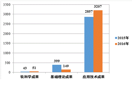 2016年陜西省共登記科技成果3407項(xiàng),與2015年相比總量增長(zhǎng)3.27%。其中,應(yīng)用技術(shù)成果3207項(xiàng),占登記成果總量的94.13%;基礎(chǔ)理論成果149項(xiàng),占4.37%;軟科學(xué)成果51項(xiàng),占1.50%。應(yīng)用技術(shù)成果占比增速明顯,而基礎(chǔ)理論成果數(shù)量則相對(duì)減少(見(jiàn)圖1)。