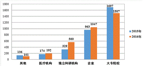 2016年登記的科技成果中,大專(zhuān)院校完成1507項(xiàng),企業(yè)1047項(xiàng),獨(dú)立科研機(jī)構(gòu)560項(xiàng),醫(yī)療機(jī)構(gòu)192項(xiàng),其他類(lèi)型單位101項(xiàng)。大專(zhuān)院校和企業(yè)是成果的主要完成單位,二者成果數(shù)量之和占成果總量的74.96%,但企業(yè)、獨(dú)立科研機(jī)構(gòu)和醫(yī)療機(jī)構(gòu)完成的成果數(shù)量均明顯增長(zhǎng)(見(jiàn)圖5)。