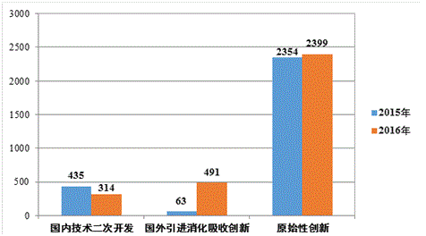 2016年登記的應(yīng)用技術(shù)成果中,原始性創(chuàng)新成果2399項(xiàng),占應(yīng)用技術(shù)成果總量的74.81%,國(guó)內(nèi)技術(shù)二次開(kāi)發(fā)成果314項(xiàng),國(guó)外引進(jìn)消化吸收創(chuàng)新成果491項(xiàng)(見(jiàn)圖6)。應(yīng)用技術(shù)成果呈現(xiàn)出以原始性創(chuàng)新成果為主,國(guó)外引進(jìn)消化吸收創(chuàng)新成果快速發(fā)展的特點(diǎn)。成果水平方面,達(dá)國(guó)際領(lǐng)先的有60項(xiàng),占應(yīng)用技術(shù)成果總量的1.87%;達(dá)國(guó)際先進(jìn)的有141項(xiàng),占4.40%;達(dá)國(guó)內(nèi)領(lǐng)先的有375項(xiàng),占11.69%,達(dá)國(guó)內(nèi)先進(jìn)的有175項(xiàng),占5.46%;其余成果未評(píng)價(jià)。
