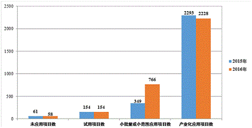 2016年登記的應(yīng)用技術(shù)成果中,產(chǎn)業(yè)化應(yīng)用項(xiàng)目2228項(xiàng),小批量或小范圍應(yīng)用項(xiàng)目766項(xiàng),試用項(xiàng)目154項(xiàng),未應(yīng)用項(xiàng)目58項(xiàng),除除小批量或小范圍應(yīng)用項(xiàng)目數(shù)較2015年迅速增長(zhǎng)外,其余項(xiàng)目數(shù)與2015年基本持平(見(jiàn)圖7),且登記的應(yīng)用技術(shù)成果中處于中期階段的成果增速明顯,較2015年增長(zhǎng)75.69%。陜西省加強(qiáng)中試環(huán)節(jié)、加快科技成果轉(zhuǎn)移轉(zhuǎn)化工作成效顯著。