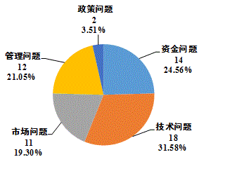 進(jìn)一步,對(duì)58項(xiàng)未應(yīng)用項(xiàng)目的影響因素進(jìn)行統(tǒng)計(jì)表明:成果未應(yīng)用的原因以技術(shù)問(wèn)題、資金問(wèn)題和管理問(wèn)題為主,其次是市場(chǎng)問(wèn)題,同時(shí)受政策等多種因素綜合影響(見(jiàn)圖8)。