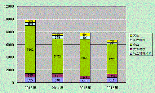 2016年登記的科技成果完成人員共6693人,其中企業(yè)參與完成的人員最多,是技術(shù)開(kāi)發(fā)的主體,占登記總數(shù)的70.57%;大專院校科研人員占7.89%;獨(dú)立科研機(jī)構(gòu)和醫(yī)療機(jī)構(gòu)完成人員分別占12.1%和4.39%。
