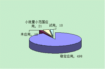 在539項(xiàng)應(yīng)用技術(shù)成果中,穩(wěn)定應(yīng)用的成果依舊保持著較高的比例,有498項(xiàng),占92.39%;未應(yīng)用的成果10項(xiàng),占1.86%;另有21項(xiàng)成果處于小批量小范圍應(yīng)用狀態(tài),10項(xiàng)成果試用。