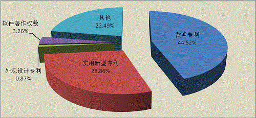 全省登記的科技成果中獲得知識(shí)產(chǎn)權(quán)1961項(xiàng),其中:發(fā)明專(zhuān)利873項(xiàng),占44.52%;實(shí)用新型566項(xiàng),占28.86%;外觀設(shè)計(jì)17項(xiàng),占0.87%;軟件著作權(quán)64項(xiàng),占3.26%;其他441項(xiàng),占22.49%(見(jiàn)圖1-1)。