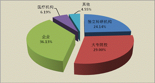企業(yè)仍然是科技成果主要完成單位,我省企業(yè)自主創(chuàng)新的主體地位和引導(dǎo)作用進(jìn)一步凸顯。在2016登記的1276項(xiàng)成果中,按成果登記量排序依次是:企業(yè)461項(xiàng),占36.13%;大專(zhuān)院校370項(xiàng),占29.00%;獨(dú)立科研機(jī)構(gòu)308項(xiàng),占24.14%;醫(yī)療機(jī)構(gòu)79項(xiàng),占6.19%;其他58項(xiàng),占4.55%。(見(jiàn)表1-1,圖1-2)。