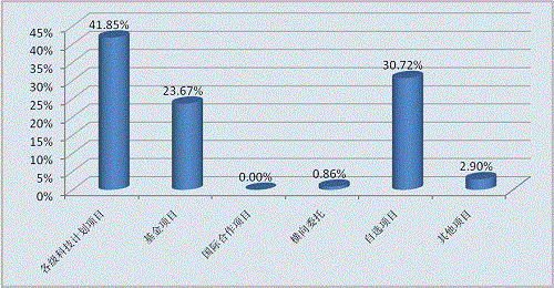 2016年登記的成果主要以各類(lèi)科技計(jì)劃項(xiàng)目為主,政府資金起主導(dǎo)作用,其中來(lái)源于各類(lèi)科技計(jì)劃項(xiàng)目的成果534項(xiàng),占登記成果總數(shù)的41.85%;基金項(xiàng)目302項(xiàng),占23.67%;橫向委托11項(xiàng),占0.86%;自選項(xiàng)目392項(xiàng),占30.72%;其他項(xiàng)目37項(xiàng),占2.90%(見(jiàn)圖1-3)。