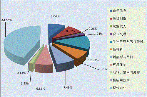 統(tǒng)計(jì)資料顯示,在899項(xiàng)應(yīng)用技術(shù)成果中,有774項(xiàng)屬于高新技術(shù)領(lǐng)域,占應(yīng)用技術(shù)成果總數(shù)的86.10%。在774項(xiàng)高新技術(shù)領(lǐng)域中,現(xiàn)代農(nóng)業(yè)領(lǐng)域的科技成果最多,達(dá)341項(xiàng),占高新技術(shù)領(lǐng)域的44.06%;其次是生物醫(yī)藥與醫(yī)療器械領(lǐng)域的科技成果,共100項(xiàng),占12.92%;電子信息領(lǐng)域70項(xiàng),占9.04%;先進(jìn)制造領(lǐng)域66項(xiàng),占8.53%;新能源與節(jié)能領(lǐng)域58項(xiàng),占7.49%;新材料領(lǐng)域56項(xiàng),占7.24%;環(huán)境保護(hù)領(lǐng)域53項(xiàng),占6.85%;現(xiàn)代交通領(lǐng)域15項(xiàng),占1.94%;地球、空間與海洋領(lǐng)域12項(xiàng),占1.55%;航空航天、核應(yīng)用技術(shù)領(lǐng)域3項(xiàng),占0.39%。另有125項(xiàng)成果屬于非高新技術(shù)領(lǐng)域(見(jiàn)圖2-2)。