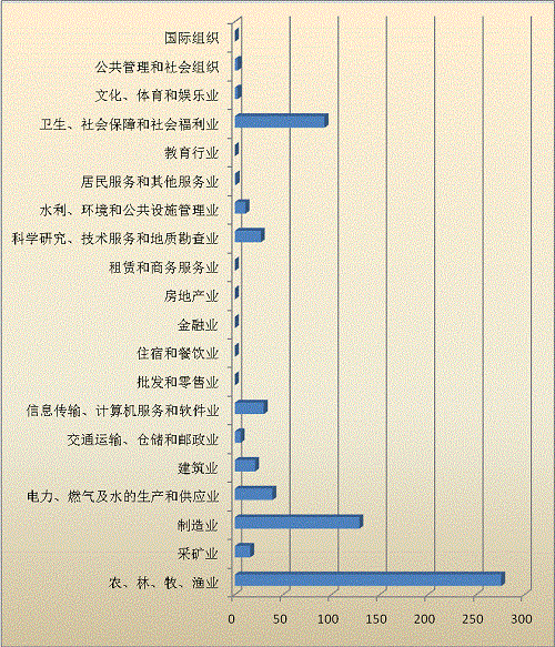 899項(xiàng)應(yīng)用技術(shù)成果,廣泛應(yīng)用在農(nóng)林牧漁業(yè)、衛(wèi)生、社會(huì)工作行業(yè)、制造業(yè)、建筑業(yè)等20個(gè)大行業(yè)中。其中,應(yīng)用于農(nóng)、林、牧、漁業(yè)的成果有429項(xiàng),占47.72%;制造業(yè)139項(xiàng),占15.46%;衛(wèi)生和社會(huì)工作行業(yè)91項(xiàng),占10.12%;建筑業(yè)41項(xiàng),占4.56%;電力、熱力、燃?xì)饧八纳a(chǎn)和供應(yīng)業(yè)35項(xiàng),占3.89%;信息傳輸、軟件和信息技術(shù)服務(wù)業(yè)34項(xiàng),占3.78%;采礦業(yè)33項(xiàng),占3.67%;水利、環(huán)境和公共設(shè)施管理業(yè)30項(xiàng),占3.34%;科學(xué)研究和技術(shù)服務(wù)業(yè)25項(xiàng),占2.78%;交通運(yùn)輸、倉(cāng)儲(chǔ)和郵政業(yè)22項(xiàng),占2.45%;公共管理和社會(huì)組織業(yè)9項(xiàng),占1.00%;教育行業(yè)4項(xiàng),占0.44%;居民服務(wù)和其他服務(wù)業(yè)3項(xiàng),占0.33%;租賃和商務(wù)服務(wù)業(yè)與文化、體育和娛樂(lè)業(yè)均為1項(xiàng),占0.11%;批發(fā)和零售業(yè)及金融業(yè)、房地產(chǎn)業(yè)、國(guó)際組織行業(yè)均無(wú)應(yīng)用。(見(jiàn)圖2-3)。
