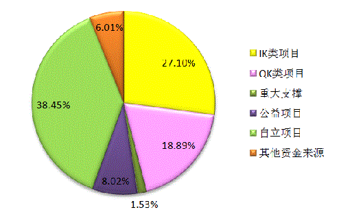 2016年,登記的1048項(xiàng)質(zhì)檢科技成果中,國(guó)家重大科技支撐項(xiàng)目16項(xiàng),占全年總數(shù)1.53%;質(zhì)檢總局科技計(jì)劃項(xiàng)目(IK類)284項(xiàng),占全年總數(shù)27.10%;質(zhì)檢總局科技計(jì)劃項(xiàng)目(QK類)198項(xiàng),占全年總數(shù)18.89%;質(zhì)檢公益性行業(yè)科研專項(xiàng)84項(xiàng),占全年總數(shù)8.02%;各地質(zhì)檢兩局和四大院自立項(xiàng)目403項(xiàng),占全年總數(shù)38.45%;其他資金來(lái)源項(xiàng)目63項(xiàng),占全年總數(shù)6.01%。因此,2016年質(zhì)檢科技成果主要登記來(lái)源是質(zhì)檢總局科技計(jì)劃項(xiàng)目、各地質(zhì)檢兩局和四大院自立項(xiàng)目,合計(jì)885項(xiàng),占全年總數(shù)84.44%。