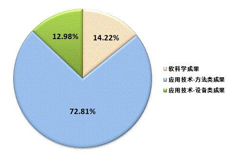 2016年,登記的1048項(xiàng)質(zhì)檢科技成果中,軟科學(xué)成果149項(xiàng),占全年總數(shù)14.22%;應(yīng)用技術(shù)成果899項(xiàng),占全年總數(shù)85.78%。因此,應(yīng)用技術(shù)成果是質(zhì)檢科技成果的主要類別。在應(yīng)用技術(shù)成果中,應(yīng)用技術(shù)-方法類成果763項(xiàng),占全年總數(shù)72.81%;應(yīng)用技術(shù)-設(shè)備類成果136項(xiàng),占全年總數(shù)12.98%。
