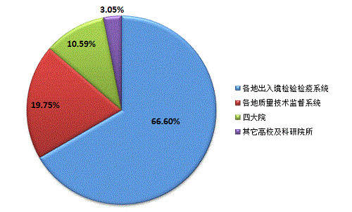 2016年,在質(zhì)檢總局進(jìn)行科技成果登記的單位組成為:質(zhì)檢總局及直屬掛靠單位、國(guó)家認(rèn)監(jiān)委、國(guó)家標(biāo)準(zhǔn)委、各地質(zhì)檢兩局及所屬事業(yè)單位、部分高校及科研院所。登記的1048項(xiàng)質(zhì)檢科技成果中,各地出入境檢驗(yàn)檢疫系統(tǒng)登記成果698項(xiàng),占全年總數(shù)66.60%;各地質(zhì)量技術(shù)監(jiān)督系統(tǒng)登記成果207項(xiàng),占全年總數(shù)19.75%;中國(guó)計(jì)量院、中國(guó)特檢院(含特種設(shè)備科技協(xié)作平臺(tái))、中國(guó)標(biāo)準(zhǔn)院、中國(guó)檢科院登記成果111項(xiàng),占全年總數(shù)10.59%;其它單位登記數(shù)量為32項(xiàng),占全年總數(shù)3.05%。