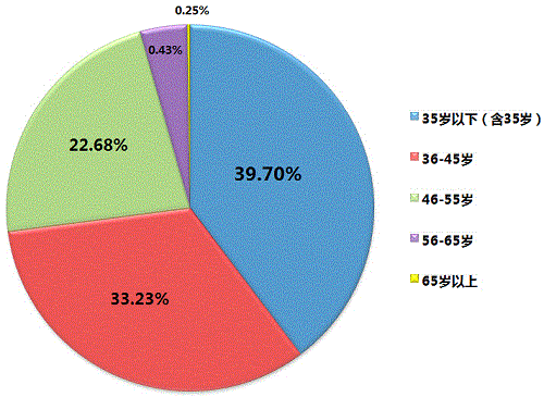 在登記人員中,35歲以下(含35歲)人員總計(jì)3116人次,占人員總數(shù)的39.70%;36-45歲人員總計(jì)2608人次,占人員總數(shù)33.23%;46-55歲總計(jì)1780人次,占人員總數(shù)22.68%;56-65歲總計(jì)325人次,占人員總數(shù)4.13%;65歲以上人員總計(jì)19人次,占人員總數(shù)0.25%。從年齡結(jié)構(gòu)上看,35歲以下(含35歲)人員,是質(zhì)檢科研的中堅(jiān)力量。