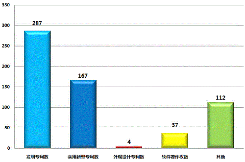 2016年登記的質(zhì)檢科技成果中,獲得專利總數(shù)607件。其中,發(fā)明專利數(shù)287件,占專利總數(shù)47.28%;實(shí)用新型專利數(shù)167件,占專利總數(shù)27.51%;外觀設(shè)計(jì)專利數(shù)4件,占專利總數(shù)0.66%;軟件著作權(quán)數(shù)37件,占6.10%;其他共有112件,占專利總數(shù)18.45%。因此,質(zhì)檢科技成果以發(fā)明專利為主,實(shí)用新型專利為輔。