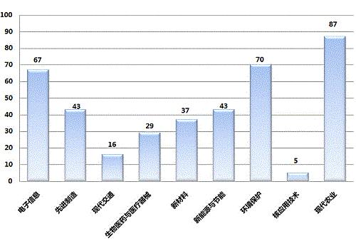 從成果所屬技術(shù)領(lǐng)域來(lái)看,電子信息領(lǐng)域成果67項(xiàng),先進(jìn)制造領(lǐng)域成果43項(xiàng),現(xiàn)代交通領(lǐng)域成果16項(xiàng),生物醫(yī)藥與醫(yī)療器械領(lǐng)域成果29項(xiàng),新材料領(lǐng)域成果37項(xiàng),新能源與節(jié)能領(lǐng)域成果43項(xiàng),環(huán)境保護(hù)領(lǐng)域成果70項(xiàng),核應(yīng)用技術(shù)領(lǐng)域成果5項(xiàng),現(xiàn)代農(nóng)業(yè)領(lǐng)域成果87項(xiàng)。